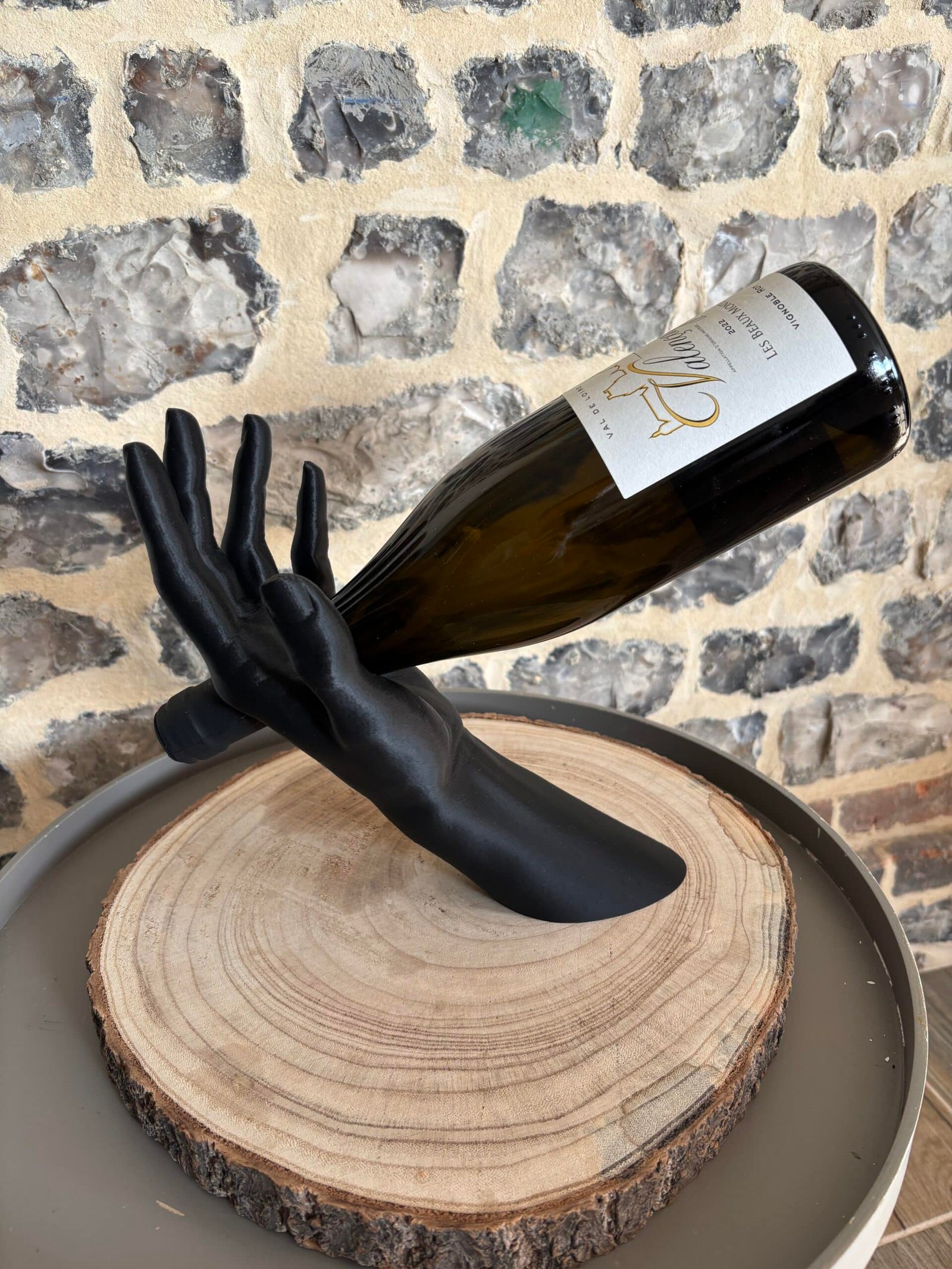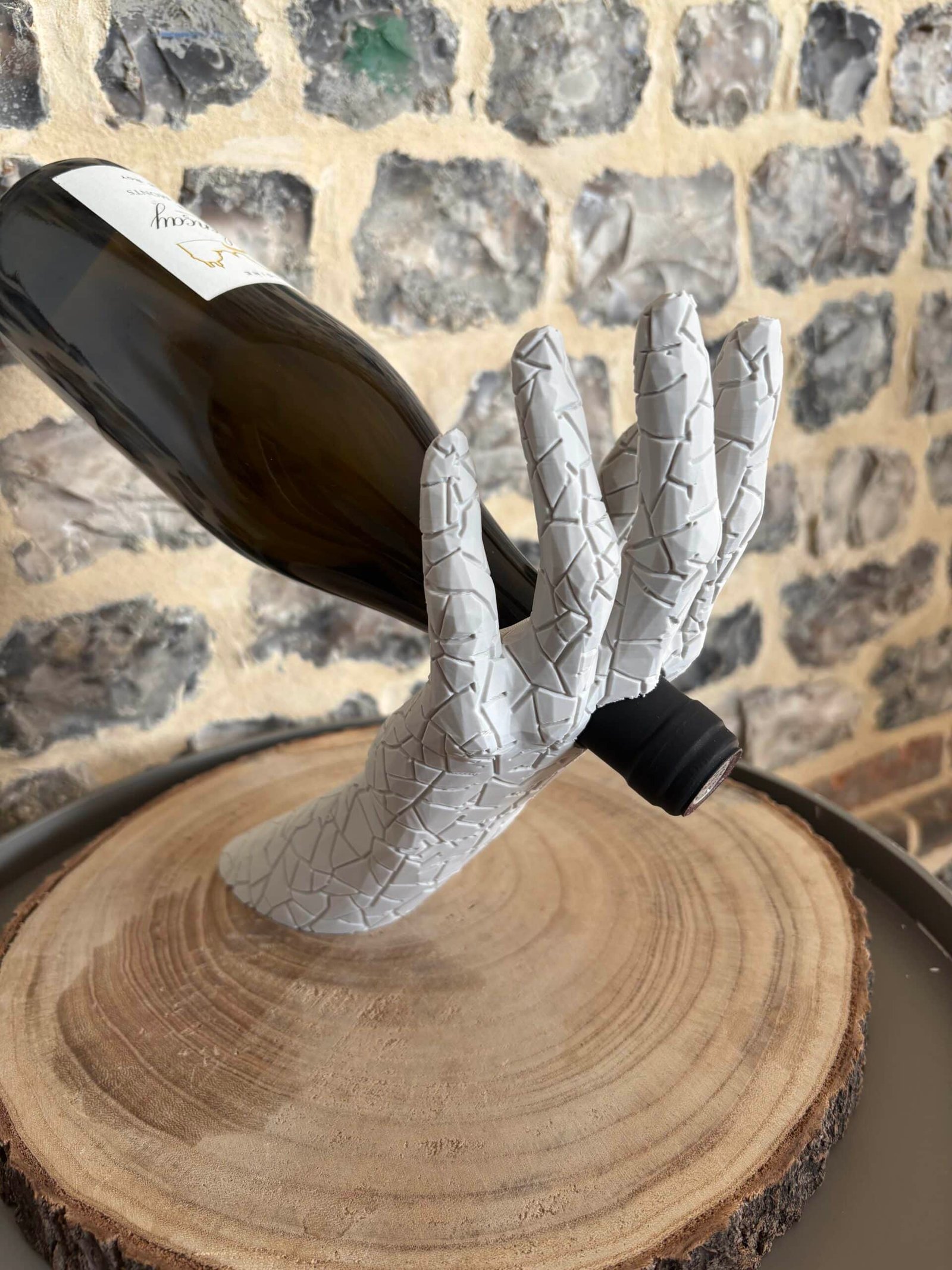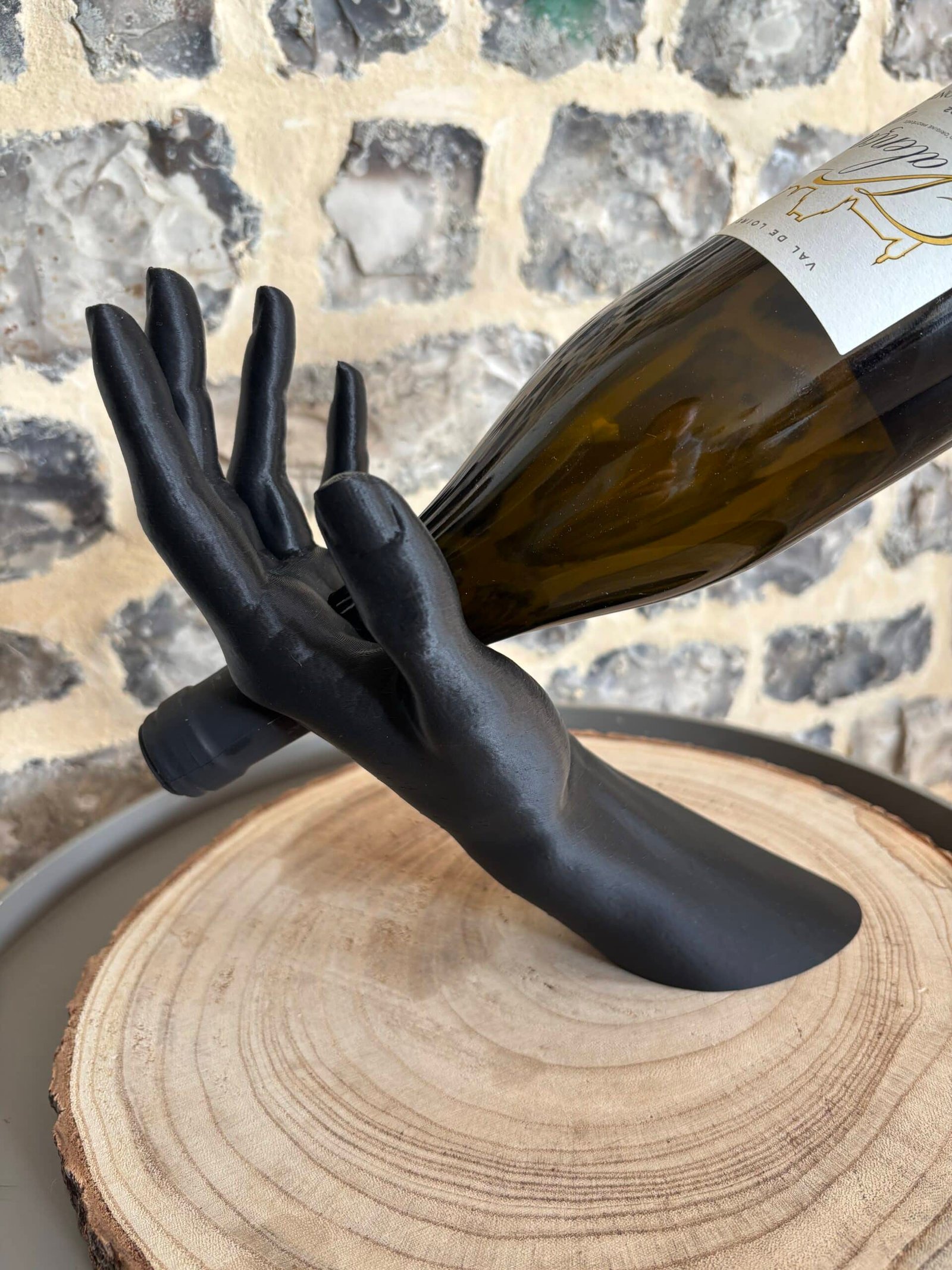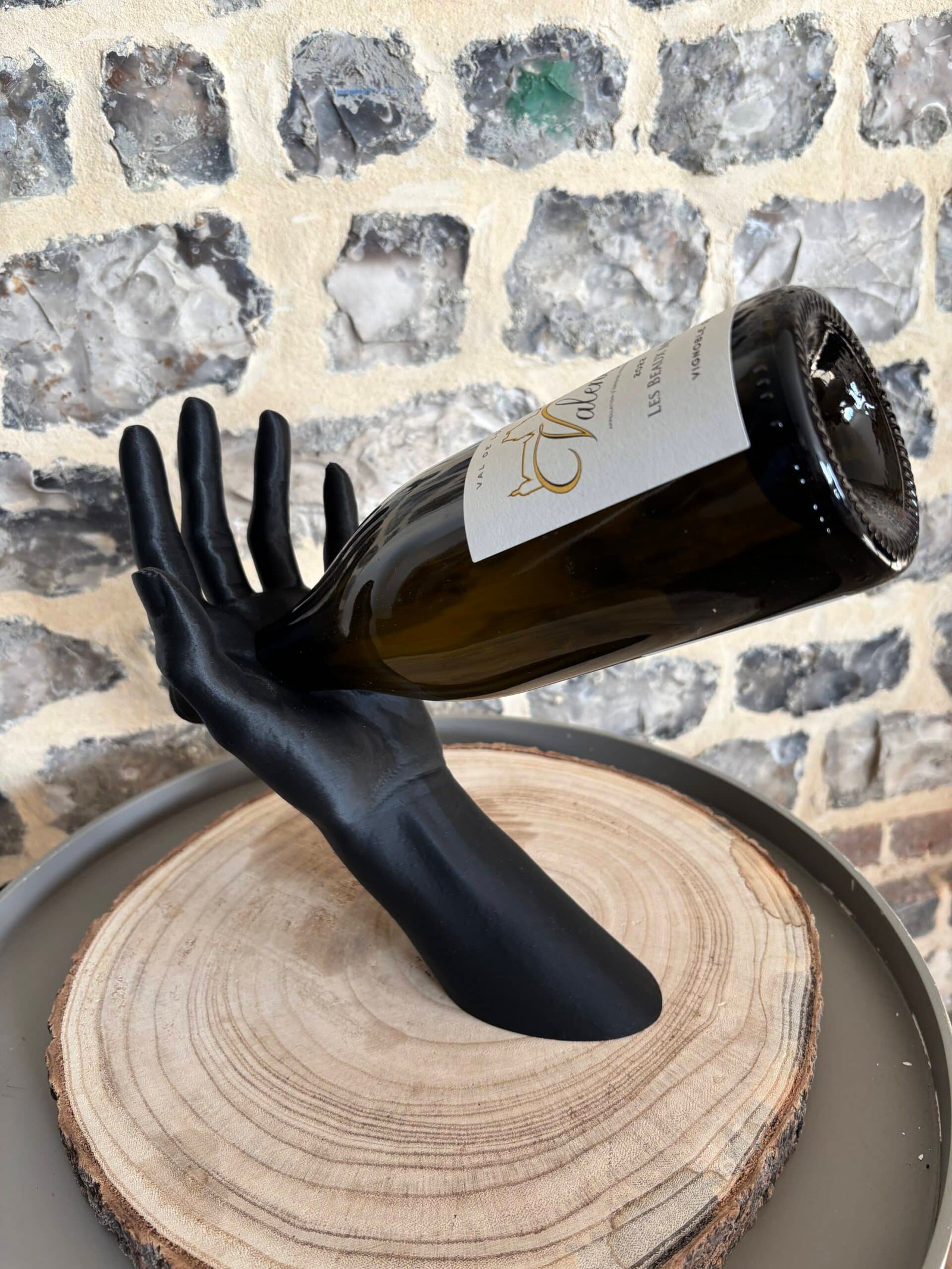 Sublimez vos dégustations avec L’Équilibre, le porte-bouteille qui allie art et élégance. Il représente un bras humain tenant délicatement une bouteille, créant un effet de lévitation spectaculaire.