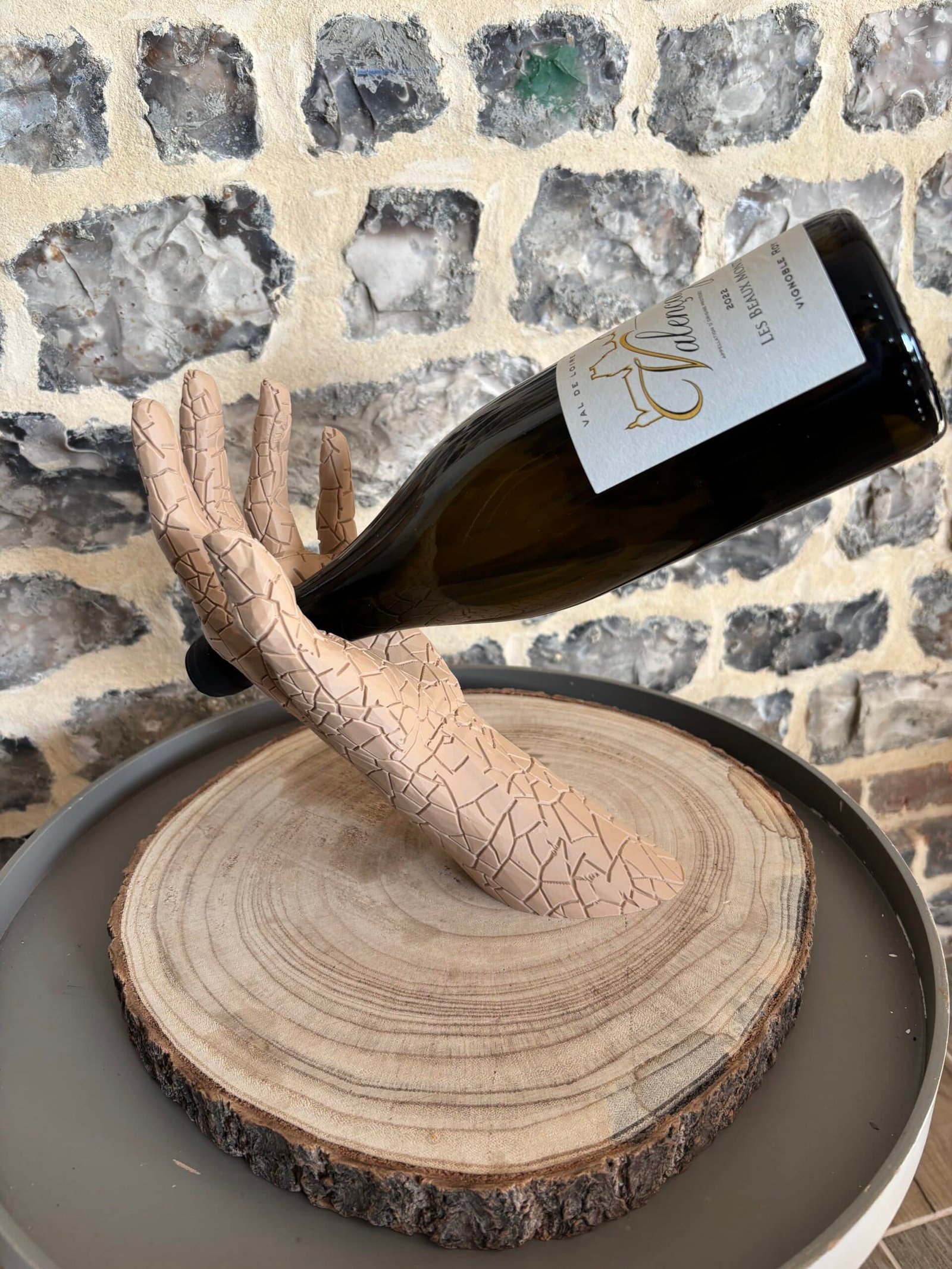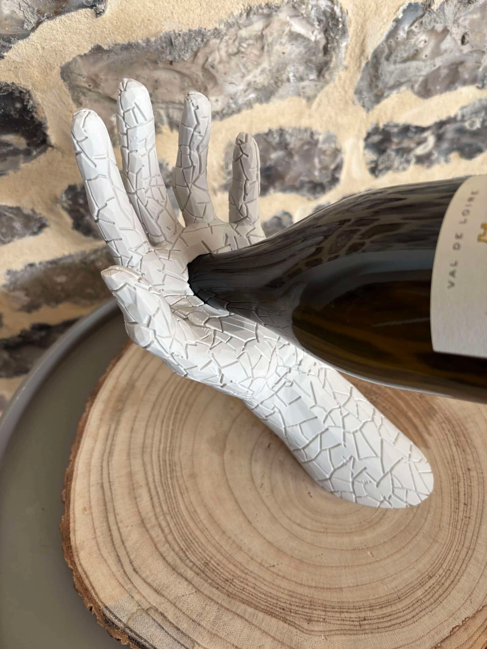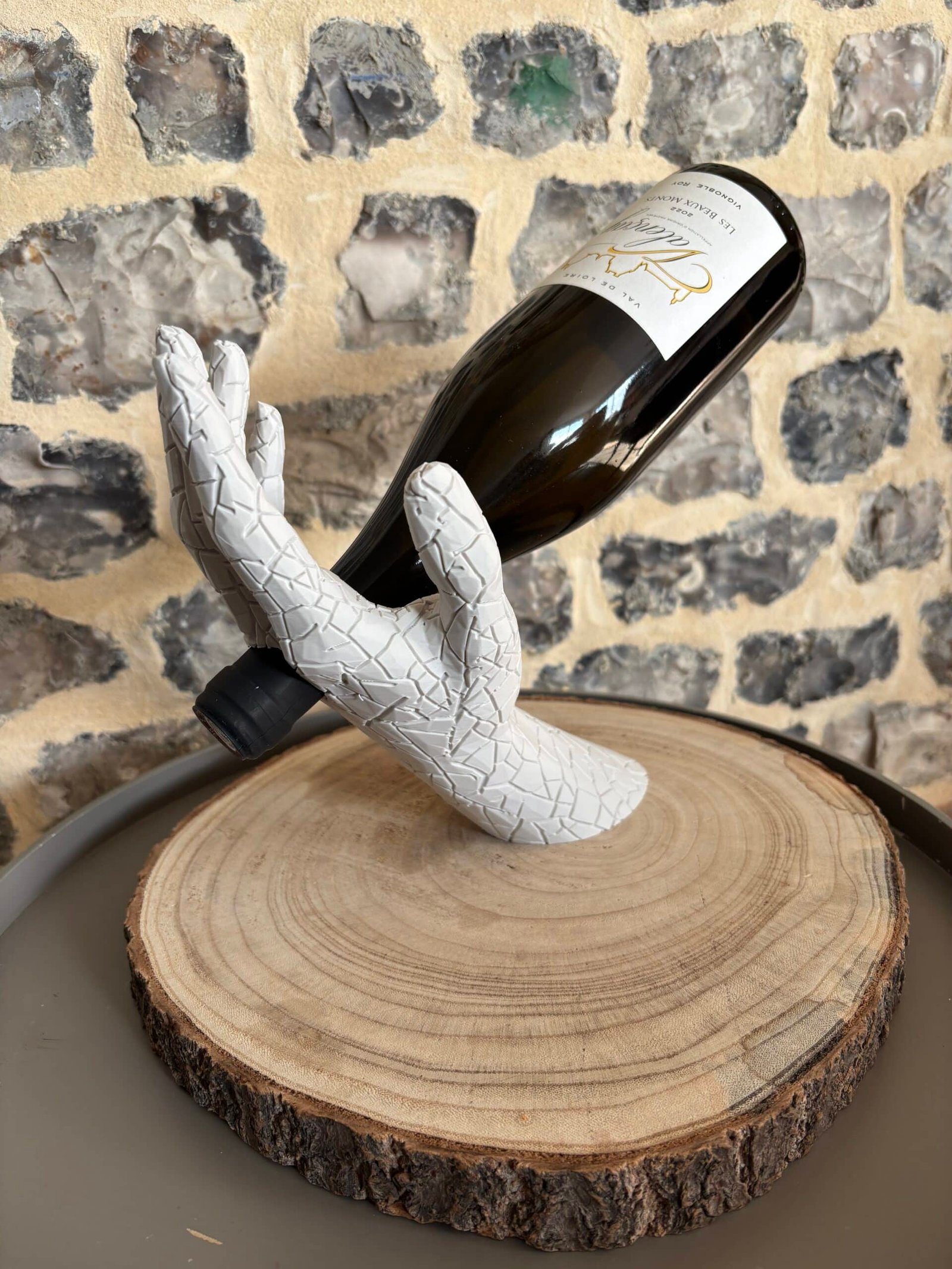 Sublimez vos dégustations avec L’Équilibre, le porte-bouteille qui allie art et élégance. Il représente un bras humain tenant délicatement une bouteille, créant un effet de lévitation spectaculaire.