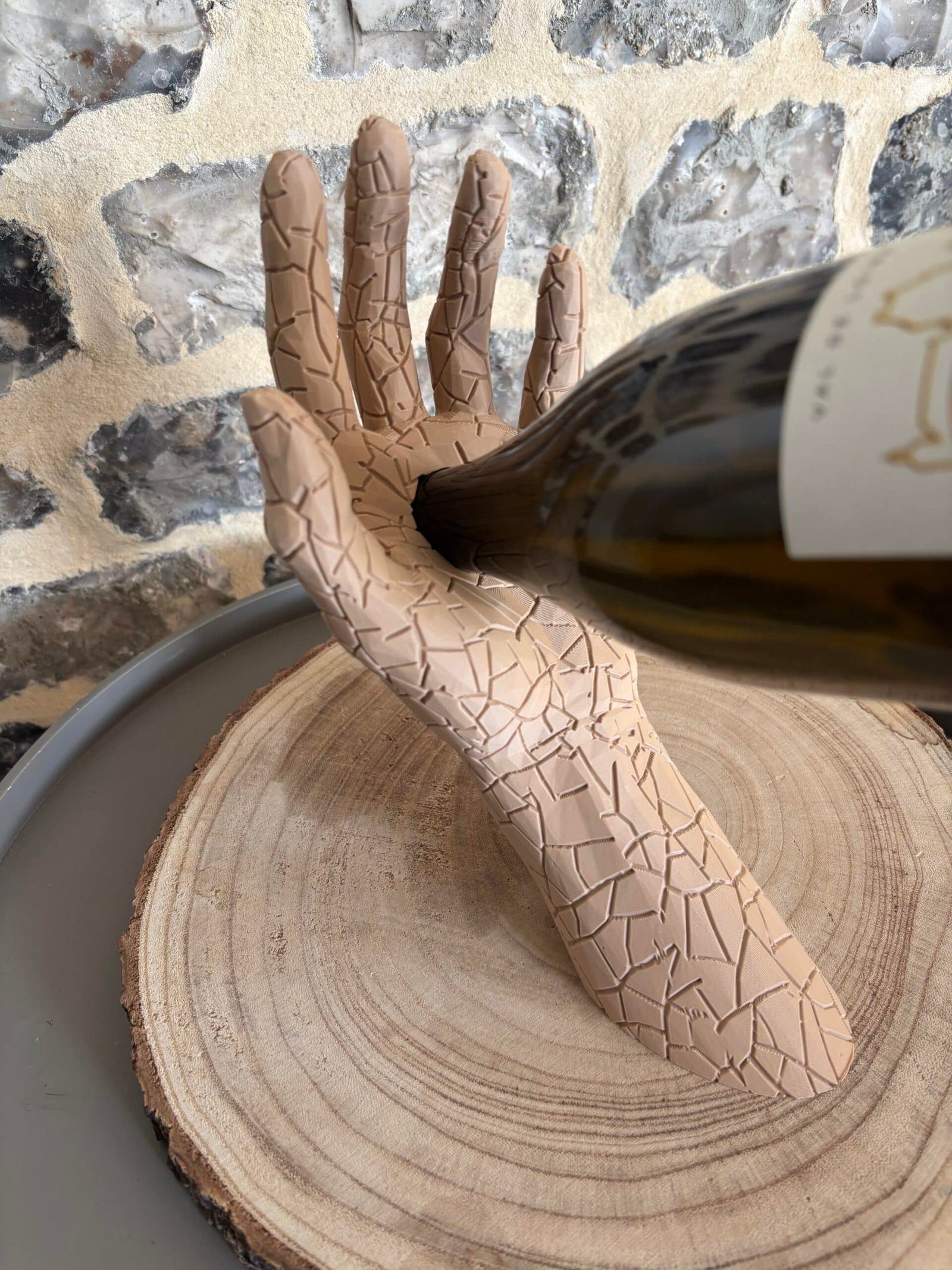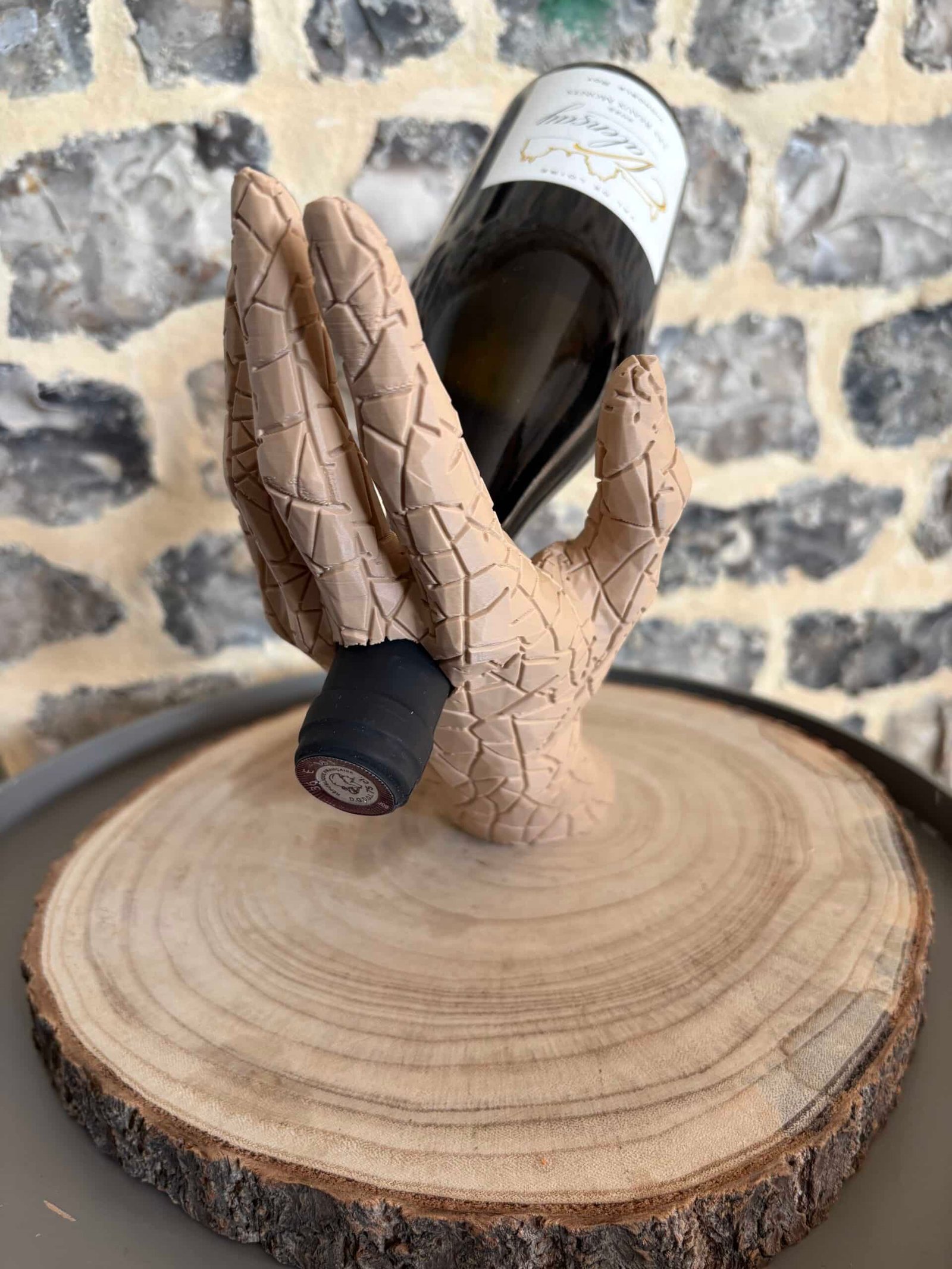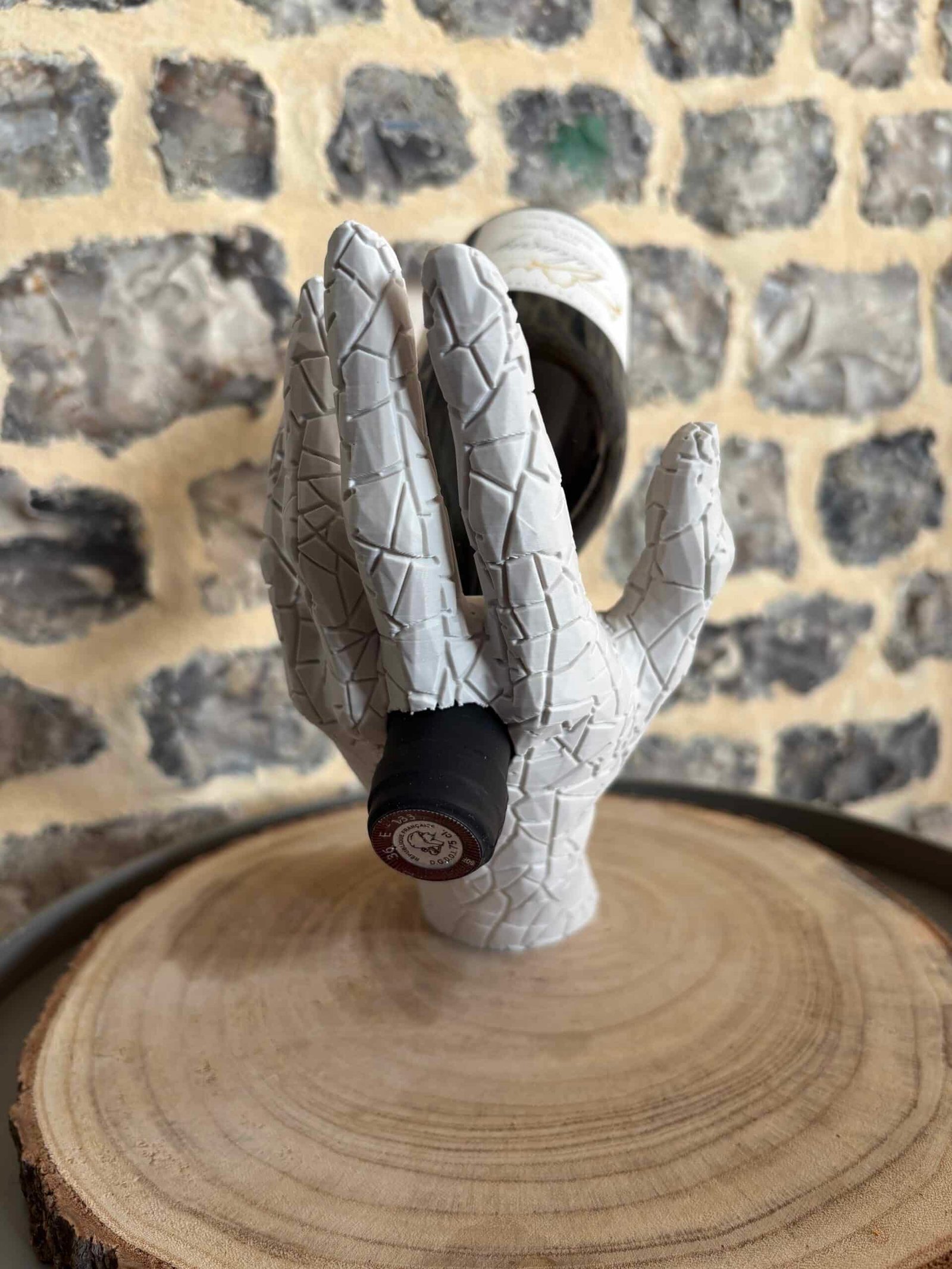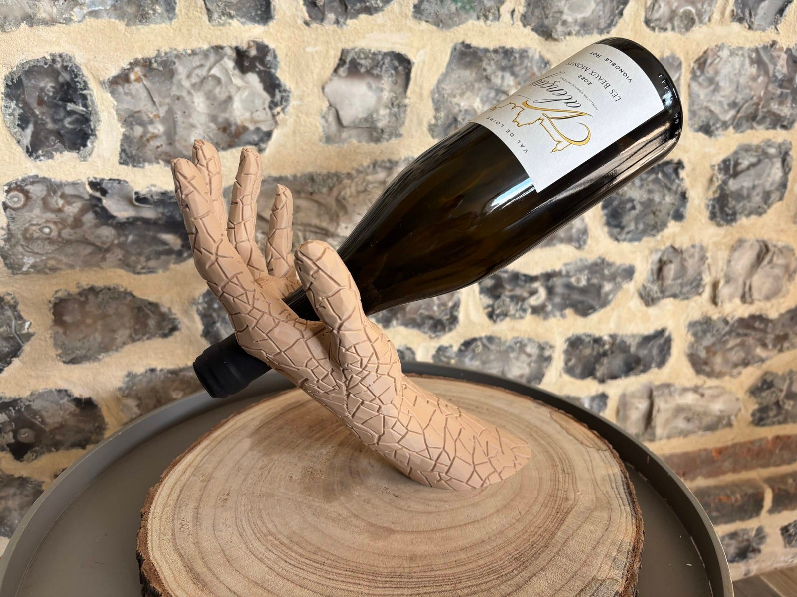 Sublimez vos dégustations avec L’Équilibre, le porte-bouteille qui allie art et élégance. Il représente un bras humain tenant délicatement une bouteille, créant un effet de lévitation spectaculaire.